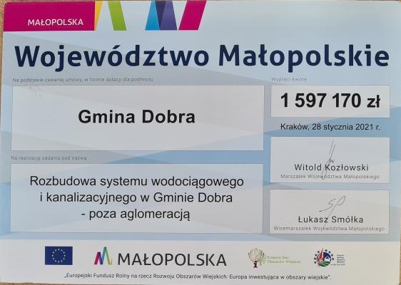 24.02.2021 r. została zawarta umowa o przyznanie pomocy finansowej na operację pn. Rozbudowa systemu wodociągowego i kanalizacyjnego w Gminie Dobra - poza aglomeracją w ramach Programu Rozwoju Obszarów Wiejskich na lata 2014-2020