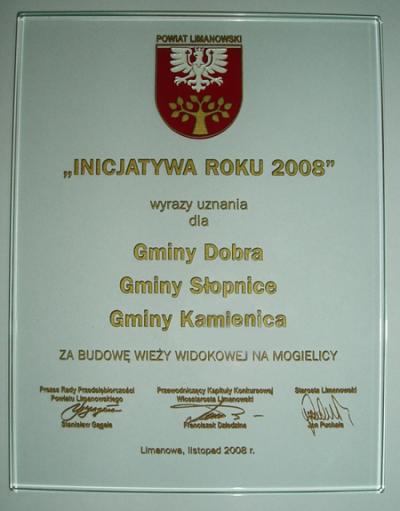 Wieża widokowa na górze Mogielica (1 171 m.n.p.m.) wybudowana została w 2008 roku, w ramach partnerskiej współpracy gmin Dobra, Kamienica i Słopnice, przy wsparciu finansowym z budżetu Województwa Małopolskiego. Wysokość wieży sięga ok. 25 m. Pomysł wybudowania wieży na Mogielicy został wyróżniony na IV Gali Przedsiębiorczości Powiatu Limanowskiego w 2008 roku jako "inicjatywa roku".