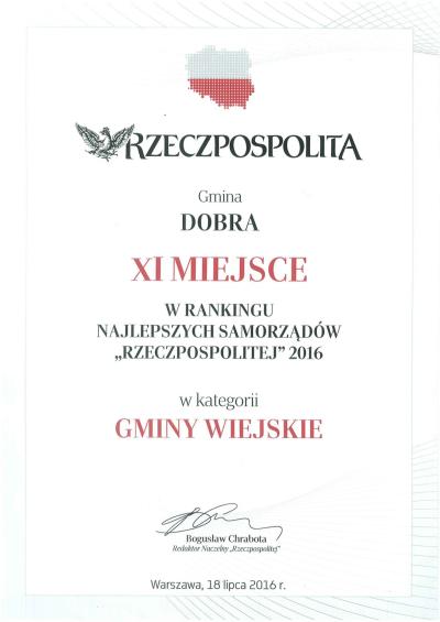 Gmina Dobra na XI Miejscu w Rankingu Najlepszych Samorządów "RZECZPOSPOLITEJ" 2016