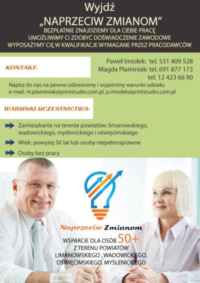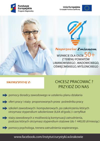 Wsparcie skierowane jest do osób po 50 roku życia lub osób niepełnosprawnych, pozostające bez zatrudnienia, które zamieszkują na terenie jednego z powiatów: limanowskiego, myślenickiego, wadowickiego, oświęcimskiego