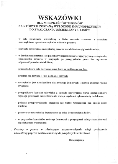 Powiatowy Lekarz Weterynarii w Limanowej informuje, że w dniach od 26 września do 05 października 2016 r. na terenie całego powiatu limanowskiego zostanie przeprowadzona akcja ochronnego szczepienia lisów wolno żyjących przeciw wściekliźnie.