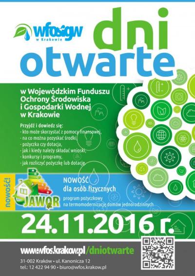 w imieniu Prezesa Zarządu Wojewódzkiego Funduszu Ochrony Środowiska i Gospodarki Wodnej w Krakowie - Pani Małgorzaty Mrugały, serdecznie zapraszamy wszystkich zainteresowanych na przedostatni już w tym roku Dzień Otwarty, który tradycyjnie odbędzie się w ostatni czwartek miesiąca, czyli 24 listopada 2016 r. w godzinach 8.00-15.00 w siedzibie Funduszu (parter, ul. Kanonicza 12).