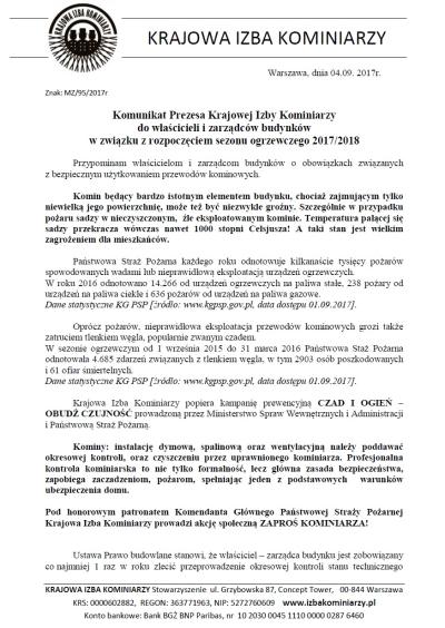 Komunikat Prezesa Krajowej Izby Kominiarzy 15.09.2017 11:25 Treść Komunikat Prezesa Krajowej Izby Kominiarzy do właścicieli i zarządców budynków w związku z rozpoczęciem sezonu ogrzewczego 2017/2018. Facebook Twitter Email Drukuj
