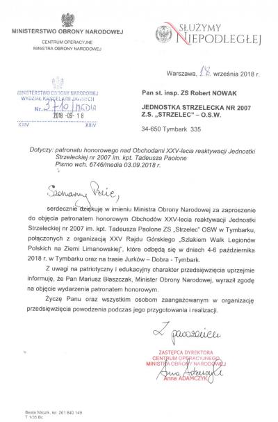 XXV Rajd Górski Szlakiem Walk Legionów Polskich Na Ziemi Limanowskiej pod honorowym patronatem Ministra Obrony Narodowej