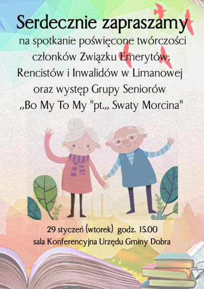 Dzienny Dom Senior + w Dobrej oraz Związek Emerytów, Rencistów w Limanowej serdecznie zaprasza na spotkanie poświęcone prezentacji twórczości poetyckiej członków Związku Emerytów, Rencistów i Inwalidów w Limanowej: Pani Marii Juszczyk, Pana Józefa Michalika oraz Pana Krzysztofa Kunickiego. Podczas spotkania będzie można nabyć tomiki z ich wierszami. Na sali wystąpi również grupa Seniorów "Bo My To My'' ze spektaklem pod tytułem "Swaty Morcina''