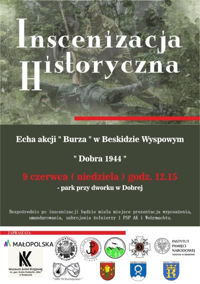 Zapraszamy na inscenizację historyczną jaka odbędzie się 9 czerwca w parku przy dworku w Dobrej, podczas której będą otworzone wydarzenia jakie miały miejsce w 1944 roku w Dobrej. W inscenizacji, będzie brało udział kilkunastu rekonstruktorów (między innymi z GRH 78. Sturmdyvision, Klubów Historycznych : im. 1 PSP AK ze Słopnic, Armii Krajowej z Olkusza), wyposażonych w motocykle, samochody, wyposażenie sprzed ponad 70 lat, które po zakończeniu inscenizacji będzie można obejrzeć.