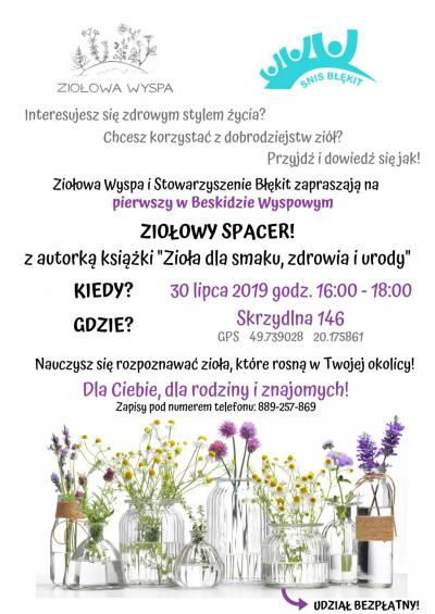 "Ziołowy Spacer" - zapraszamy na spotkanie 09.07.2019 13:42 Treść Stowarzyszenie Błękit i Ziołowa Wyspa zaprasza na pierwszy w Beskidzie Wyspowym ZIOŁOWY SPACER 30 lipca 2019 r. o godz.16:00 w Skrzydlnej 146. Facebook Twitter Email Drukuj