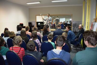 Pokazową lekcję połączoną z warsztatami zorganizował i poprowadził Paweł Miśkowicz, dyrektor Szkoły Muzycznej I st. w Dobrej, który od początku wspiera i aktywnie uczestniczy w projekcie realizowanym przez OSP Dobra. Dyrektor przedstawił historię instrumentu, a takze wprowadził uczestników spotkania w świat muzyki.