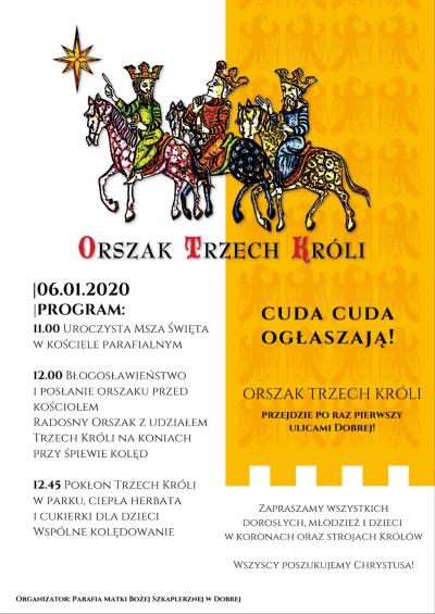 Orszak Trzech Króli w Dobrej 16.12.2019 8:49 Treść W imieniu Parafii Matki Bożej Szkaplerznej w Dobrej zapraszamy młodzież, dorosłych oraz dzieci w koronach oraz strojach królów na pierwszy Orszak Trzech Króli, który przejdzie ulicami Dobrej Facebook Twitter Email Drukuj