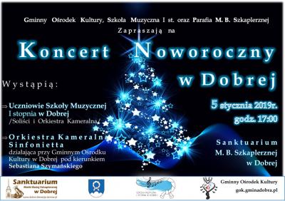 KONCERT NOWOROCZNY W DOBREJ 18.12.2019 15:26 Treść Gminny Ośrodek Kultury, szkoła Muzyczna I Stopnia oraz Parafia M. B. Szkaplerznej zapraszają na Koncert Noworoczny, który odbędzie się 5 stycznia 2020 roku w Sanktuarium M. B. Szkaplerznej w Dobrej o godz.17:00. Facebook Twitter Email Drukuj
