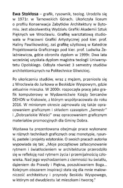 Zapraszamy serdecznie na otwarcie wystawy prac pani Ewy Stokłosy - grafika, rysownika i teologa. Spotkanie odbędzie się w Gminnym Ośrodku Kultury w Dobrej (budynek Gminnego Przedszkola w Dobrej, Dobra 490) w piątek 14 lutego 2020 r. o godzinie 18:00. W trakcie spotkania artystka opowie o swoich pracach i o tym co ją inspiruje. Będzie również przygotowany mini kącik dla dzieci aby mogły zająć się chwilkę zabawą, kiedy dorośli będą zajęci.