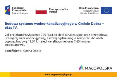 Zakończono prace przy rozbudowie systemu wodno-kanalizacyjnego na terenie Gminy Dobra realizowane przez firmę HYDROTECH-PLUS KAROL URBANIAK z Pisarzowej. Nowa sieć kanalizacji sanitarnej powstała w części miejscowości Dobra (osiedla Drożdże, Noworolniki, Olejarze, Myconie, Kutry, Ćwiecie, Chalcarze, Biernaty, Chochoły, Rybki) o łącznej długości ok. 11,5 km. Sieć wodociągowa również obejmuje ten rejon, a jej łączna długość wynosi prawie 9,5 km.