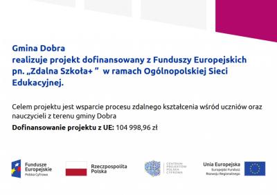 Zgodnie z Umową o Powierzenie Grantu nr 7371005969 z dnia 15.06.2020 r. realizowanego w ramach Programu Operacyjnego Polska Cyfrowa na lata 2014-2020 Osi Priorytetowej nr I „Powszechny dostęp do szybkiego Internetu” działania 1.1: „Wyeliminowanie terytorialnych różnic w możliwości dostępu do szerokopasmowego Internetu o wysokich przepustowościach” dotycząca realizacji projektu grantowego pn. Zdalna Szkoła+ w ramach Ogólnopolskiej Sieci Edukacyjnej zakupiono i przekazano placówkom oświatowym z terenu Gminy Dobra 44 zestawy komputerowe skłądające się z laptopa, myszki oraz pokrowca.