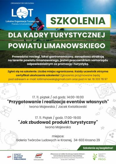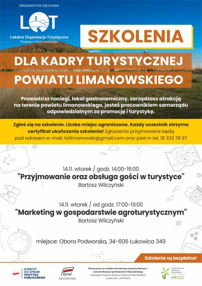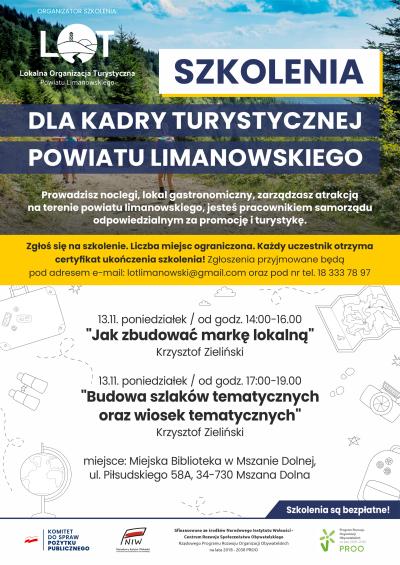 Lokalna Organizacja Turystyczna Powiatu Limanowskiego realizując projekt pn. „Akademia Turystyki Powiatu Limanowskiego”, finansowany z budżetu Narodowego Instytutu Wolności – Centrum Rozwoju Społeczeństwa Obywatelskiego, ze środków Programu Rozwoju Organizacji Obywatelskich na lata 2018-2030, ogłasza nabór na szkolenia specjalistyczne dla kadr turystycznych, władz samorządowych, oraz zarządzających atrakcjami turystycznymi w powiecie limanowskim.