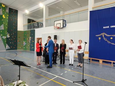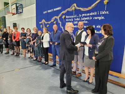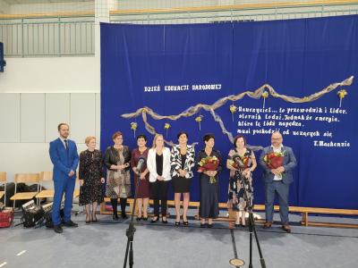 W trakcie uroczystości Wójt Gminy Dobra wręczył 15 nagród dla nauczycieli z terenu Gminy Dobra. To wyróżnienie miało na celu docenienie ich wysiłków oraz osiągnięć w pracy z dziećmi. Wójt podkreślił, jak istotna jest ich rola w ukierunkowywaniu młodych ludzi, rozwijaniu ich pasji i uzdolnień. Również dyrektorzy szkół dołączyli do tej inicjatywy, honorując zasłużonych pedagogów oraz pracowników administracyjnych swoimi nagrodami. Uroczystość była doskonałą okazją do wyrażenia wdzięczności za oddanie i trud, jaki nauczyciele wkładają w swoją pracę na co dzień.