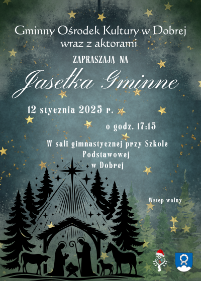 Zaproszenie na Jasełka Gminne 07.01.2025 8:04 Treść Gminny Ośrodek Kultury w Dobrej wraz z aktorami zapraszają na Jasełka Gminne, które odbędą się 12 stycznia o godzinie 1715 w sali gimnastycznej przy Szkole Podstawowej w Dobrej. Serdecznie zapraszamy! Facebook Twitter Email Drukuj