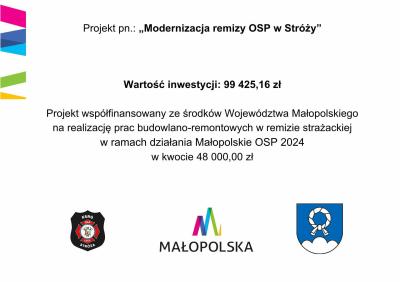 Projekt współfinansowany ze środków Województwa Małopolskiego na realizację prac budowlano-remontowych w remizach strażackich w ramach działania „Małopolskie OSP 2024” w kwocie 48 000,00 zł.