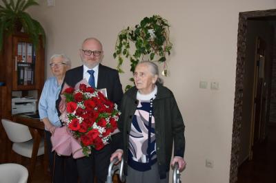 Z tej okazji najlepsze życzenia dalszych lat w zdrowiu i wszelkiej pomyślności, złożyli: Dostojnej Jubilatce Pan Benedykt Węgrzyn - Wójt Gminy Dobra, Pani Iwona Drzyzga - Z-ca Kierownika Urzędu Stanu Cywilnego w Dobrej, Pani Beata Szyrszeń - Radna Gminy Dobra, Pani Danuta Miśkowiec - Sołtys wsi Gruszowiec oraz Pan Andrzej Gołąb - Kierownik Zakładu Ubezpieczeń Społecznych w Limanowej. Przekazano również listy gratulacyjne od Prezesa Rady Ministrów i Wojewody Małopolskiego.