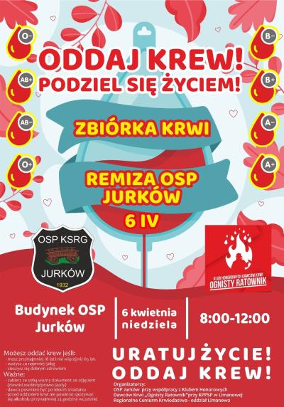 Oddaj krew! Podziel się życiem! 24.03.2025 16:21 Treść Dnia 6 kwietnia 2025 r. od 8:00 do 12:00 w budynku remizy OSP Jurków odbędzie się zbiórka krwi! Krew może oddać każda zdrowa osoba w wieku 18-65 lat o wadze ciała powyżej 50kg. Serdecznie zachęcamy do włączenia się w tą akcję! Facebook Twitter Email Drukuj