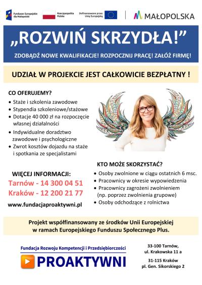 Fundacja Rozwoju Kompetencji i Przedsiębiorczości PROAKTYWNI zaprasza do udziału w XIII edycji projektu „Rozwiń SKRZYDŁA!”. Projekt ten jest współfinansowany ze środków Europejskiego Funduszu Społecznego Plus w ramach programu Fundusze Europejskie dla Małopolski 2021-2027, Priorytetu 6. Fundusze europejskie dla rynku pracy, edukacji i włączenia społecznego, Działania 6.6 Rozwój kompetencji kadr i adaptacja do zmian.