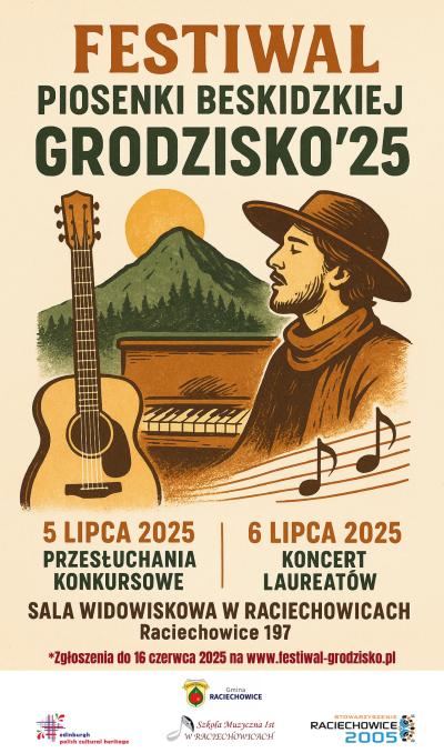Gmina Raciechowice przy współpracy ze Szkołą Muzyczną I stopnia w Raciechowicach, Stowarzyszeniem „Raciechowice 2005” oraz Edinburgh Polish Cultural Heritage zaprasza do wzięcia udziału w Festiwalu Piosenki Beskidzkiej Grodzisko’25,