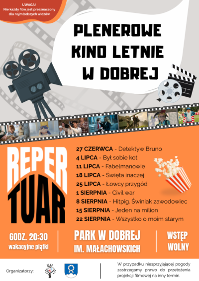 Zapraszamy na tegoroczną edycję Plenerowego Kina Letniego w Dobrej w wakacyjne piątki w parku im. Małachowskich w Dobrej o godzinie 20:30.