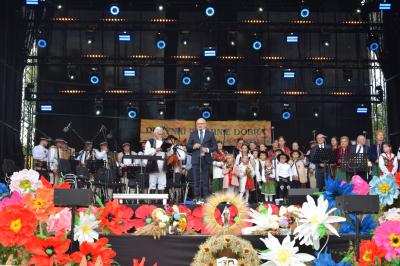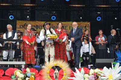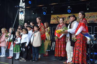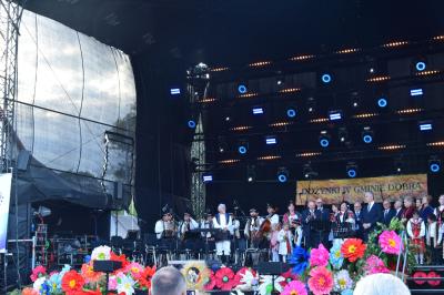 Wójt Gminy Dobra oficjalnie rozpoczął święto plonów poprzez serdeczne powitanie przybyłych gości i mieszkańców, dziękując za ich zaangażowanie w przygotowania do tego wyjątkowego święta. Momentem szczególnej symboliki była ceremonia wręczenia Darów Dożynkowych, podczas której przedstawiciele poszczególnych sołectw Gminy przekazali tradycyjne dary: Sołectwo Chyszówki reprezentowane przez pana Ryszarda Sarysza wręczyło chleb Wójtowi Gminy, Sołectwo Skrzydlna z panem Józefem Trzópkiem na czele ofiarowało kosz dożynkowy Przewodniczącemu Rady Gminy Dobra, Sołectwo Gruszowiec pod przewodnictwem pani Danuty Miśkowiec przekazało wieniec dożynkowy przedstawicielowi powiatu Limanowskiego - Panu Wojciechowi Włodarczykowi.