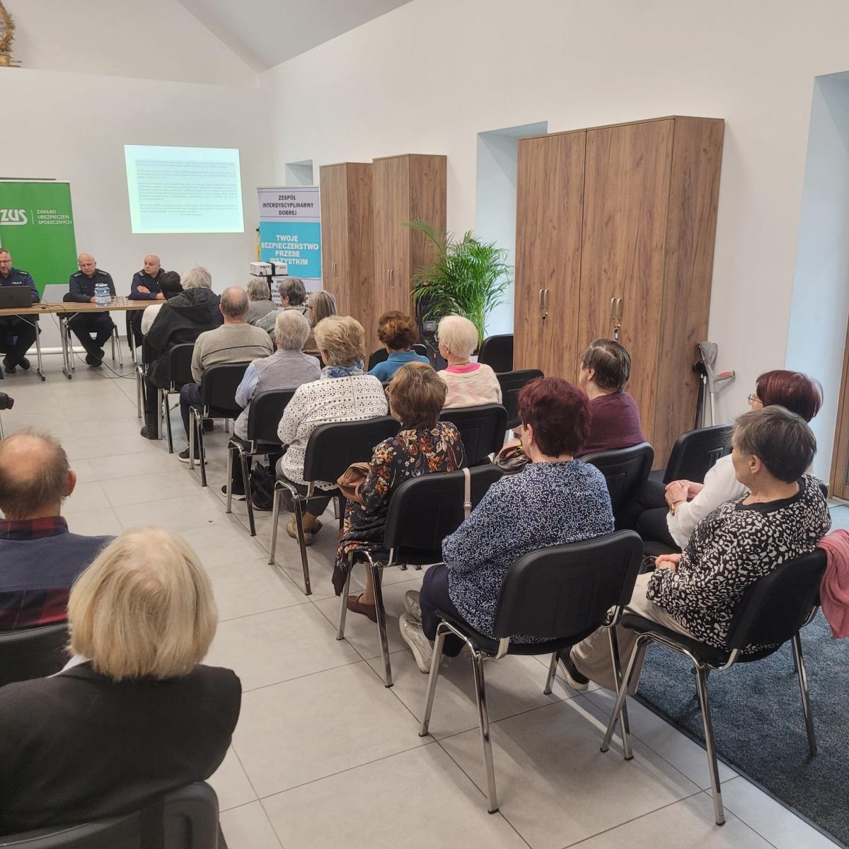 W dniu 15 października 2025r. w Gminie Dobra odbyła się debata organizowana przez POLICJĘ, z udziałem przedstawicieli Urzędu Gminy, Gminnego Ośrodka Kultury, Dziennego Domu Senior Plus, Zakładu Ubezpieczeń Społecznych, Poczty Polskiej oraz Banku Spółdzielczego.