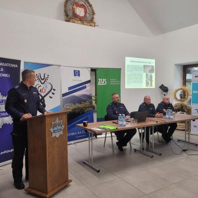 Przedstawiciel Policji Komendant Tomasz Guzik omówił system Krajowej Mapy Zagrożeń, program „Dzielnicowy bliżej nas” oraz aplikację „Moja komenda”. Zachęcał do korzystania z tych narzędzi, przedstawił sposób ich działania i zalety.