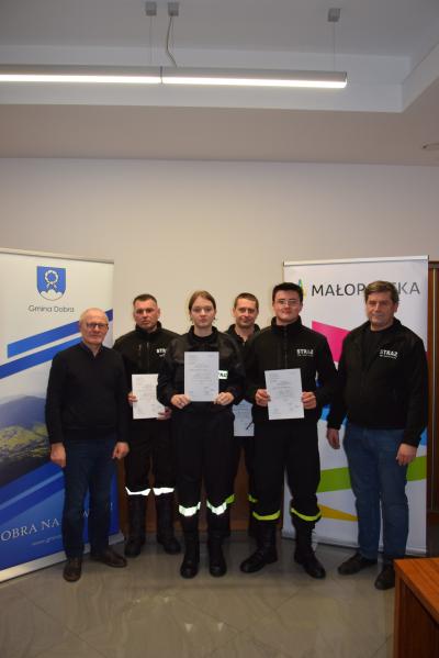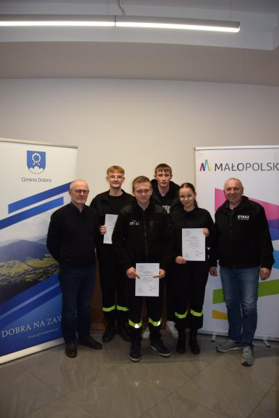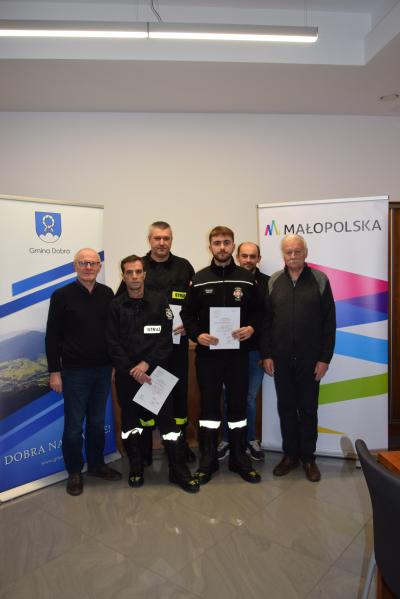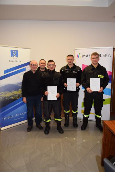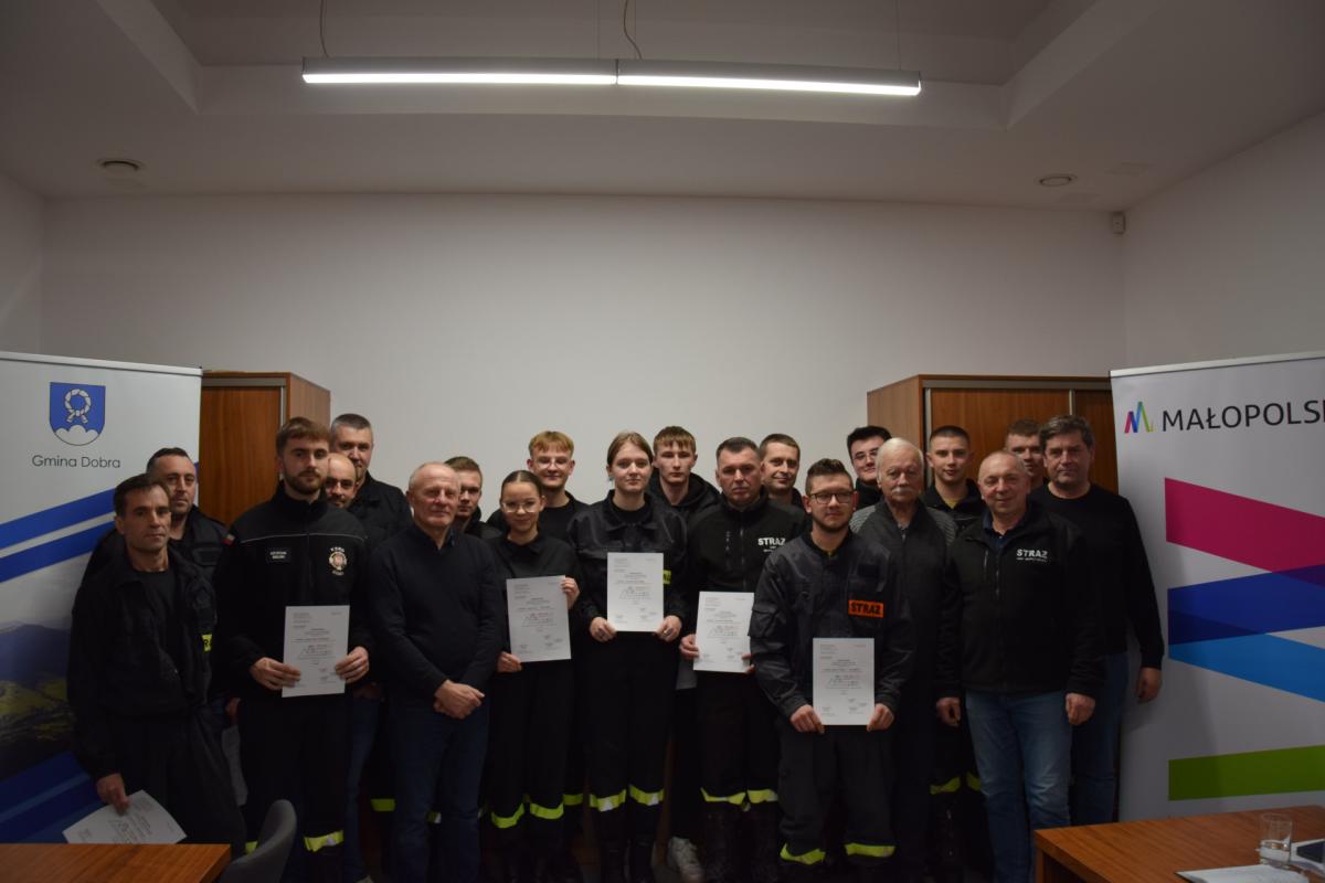 W spotkaniu uczestniczyli Przewodniczący Rady Gminy Dobra Jan Palki, Prezes OSP Dobra Stanisław Olesiak, Prezes OSP Łukasz Chalcarz, Prezes OSP Skrzydlna Jan Smaga, Prezes OSP Stróża Robert Cieślak oraz druhowie biorący udział w szkoleniu.