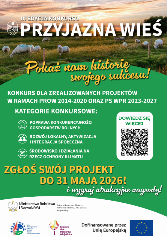 UWAGA! W konkursie nie zostaną przyjęte do oceny projekty, które zostały ocenione w pierwszej oraz drugiej edycji konkursu „Przyjazna Wieś” w latach 2023 oraz 2025, laureaci ogólnopolskiego konkursu „Sposób na sukces” (wszystkie edycje) oraz projekty, które znajdują się w Bazie dobrych praktyk — https://www.ksowplus.pl/baza-danych/baza-dobrych-praktyk
