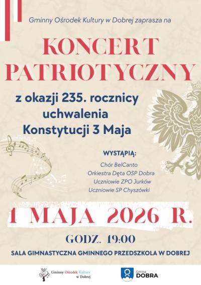 Serdecznie zapraszamy na koncert z okazji 235. rocznicy uchwalenia Konstytucji 3 Maja, który odbędzie się