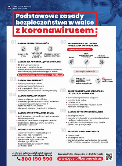 PODSTAWOWE ZASADY BEZPIECZEŃSTWA ZWIĄZANE Z EPIDEMIĄ COVID-19 07.04.2020 10:25 Treść Zachęcamy do zapoznania się z plakatem informującym o podstawowych zasadach bezpieczeństwa związanych z epidemią Covid-19 Facebook Twitter Email Drukuj