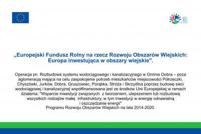 24.02.2021 r. została zawarta umowa o przyznanie pomocy finansowej na operację pn. Rozbudowa systemu wodociągowego i kanalizacyjnego w Gminie Dobra - poza aglomeracją w ramach Programu Rozwoju Obszarów Wiejskich na lata 2014-2020