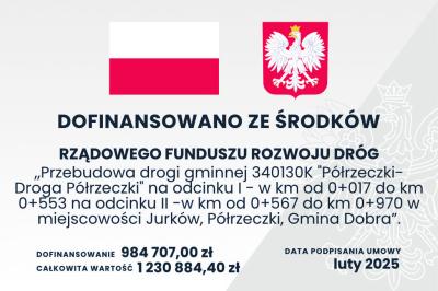 Gmina Dobra w dniu 10 lutego 2025 roku podpisała umowę z Wojewodą Małopolskim na dofinansowanie zadania pn. Przebudowa drogi gminnej 340130K "Półrzeczki-Droga Półrzeczki" na odcinku I - w km od 0+017 do km 0+553 na odcinku II -w km od 0+567 do km 0+970 w miejscowości Jurków, Półrzeczki, Gmina Dobra” ze środków Rządowego Funduszu Rozwoju Dróg.